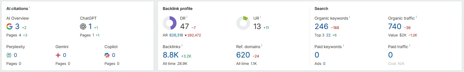 • Google: 3 citations (+2), covering 4 pages (+3) — 📈 Growing visibility in AI-driven search results, reflecting increased authority and reach.
